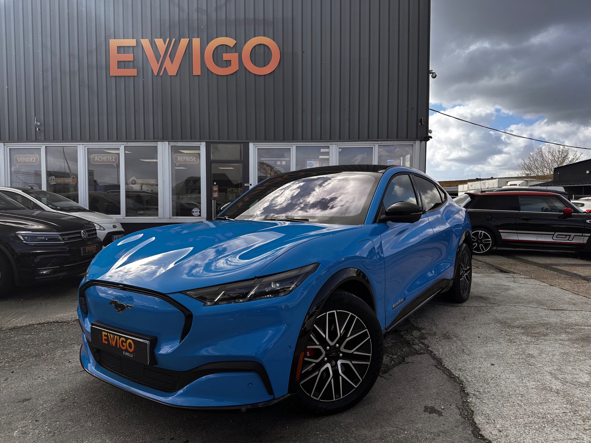 Pack Mach-E Rally Kit carrosserie spécifique, toit peint en noir, bequet sport élargi, jantes 19'' Rally blanches, pédalier finition métallique, bandes décoratives capot et latérales, mode de conduite spécifique "Rally", suspension réhaussée de 20mm, sellerie Sensico avec sièges AV embossés "Mach-E Rally" et coques AR blanc laqué (0 €)